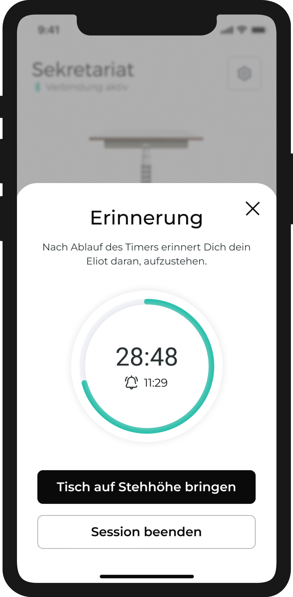 Smartphone Mockup der Eliot Smartfurniture App; Sichtbar ist das Dashboard zur Live Steuerung der Höhen, Zugriff auf die Timerfunktionalität und hinterlegte Höhen.